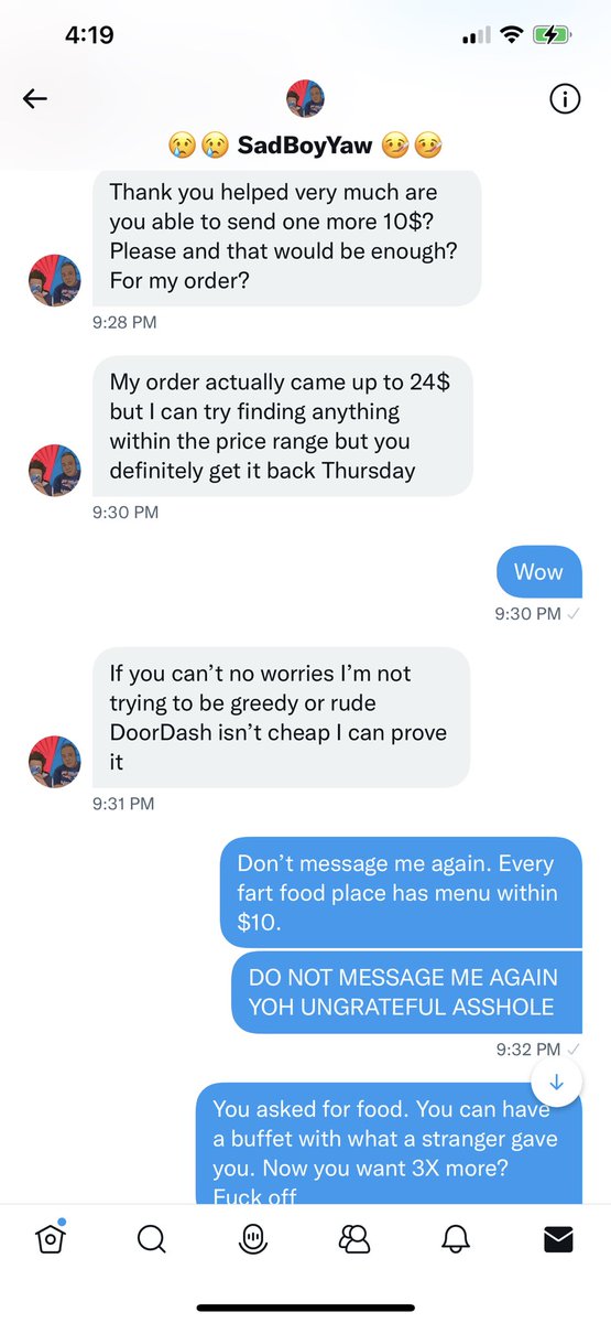 I get asked for money a lot on this app by strangers. I sent $10 thinking I was being helpful. And then he got greedy. WHO ACTS LIKE THIS!? https://t.co/KSejqoxa1J