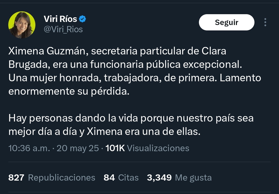 DΓ­ganle a la SeΓ±ora @Viri_Rios que Ximena no dio la vida, que a ella se la quitaron en las calles de la CDMX mientras manejaba, a plena luz del dΓ­a. https://t.co/c71RJCQqGK