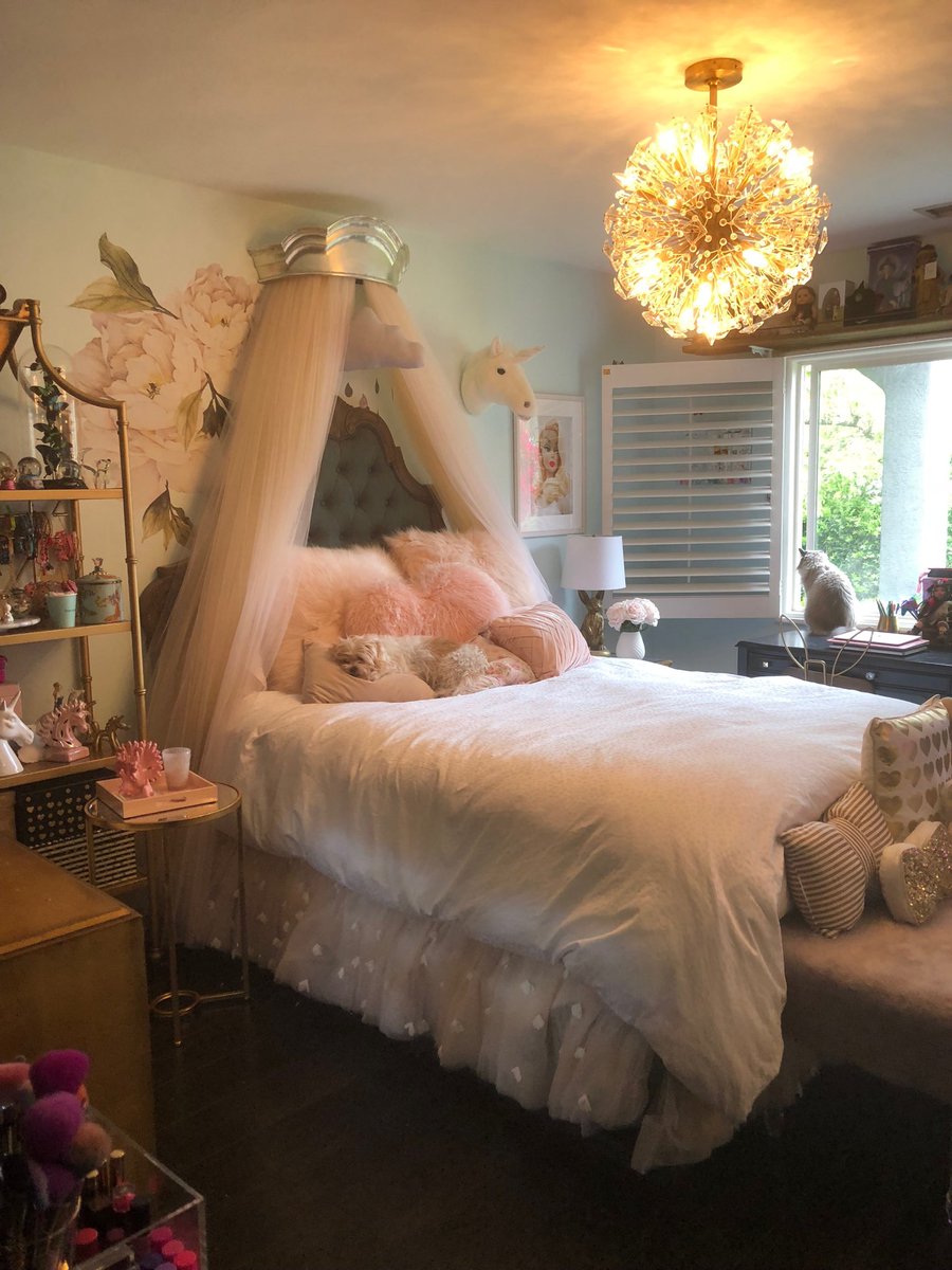 I admit sometimes when my girl is at school I come to her room with the cat and dog (the other cat and the other dog) and hang. When I was her age, I had green shag carpet, yellow walls and white wicker furniture. Very “of the time” my mom would say. Lol. https://t.co/KHOUXgmZ79