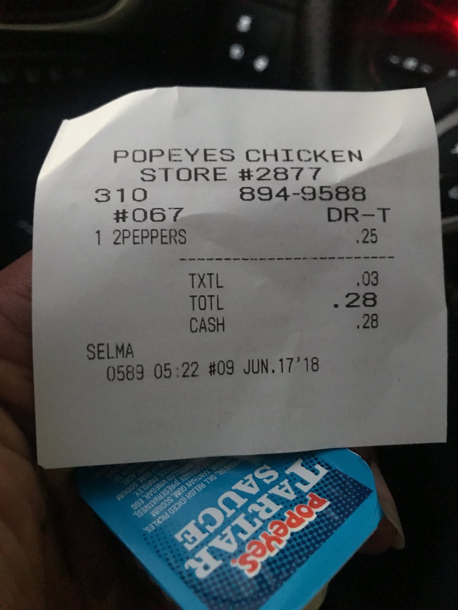 @PopeyesChicken how your restaurant charge for tartar Sauce but gives me a receipt for 2 peppers....I ordered a half pound of shrimp I can’t get 2 tartar sauces ... https://t.co/idAf6BWWfV