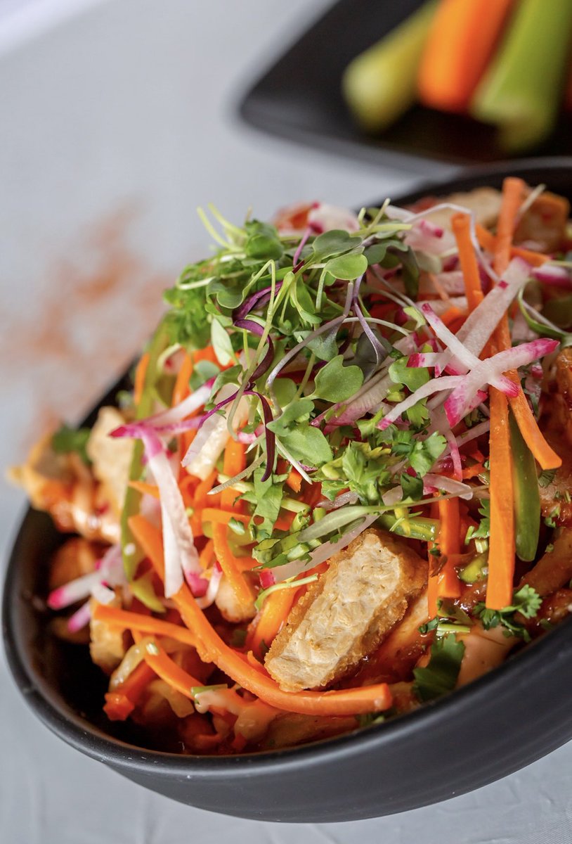 BAHN MI FRIES : French fries, crispy chicken, sweet Thai sauce, picked veggies, cilantro, spicy aioli, radishes, micro greens