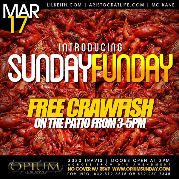 Sunday Funday at #OPIUM Starts this Sunday (3030 Travis, Across from 5th Amendment) | FREE crawfish on patio 3-5pm http://t.co/iyx6zZM6xJ