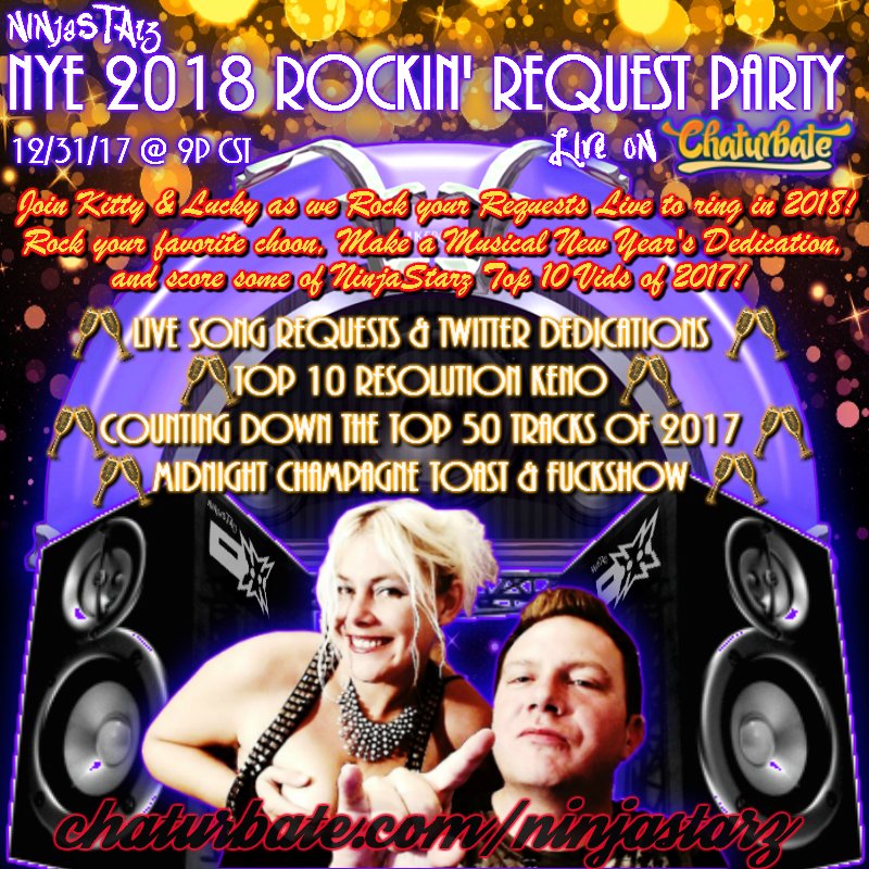 Cum party with Kitty & Lucky & get turnt up #NinjaStyle on #NYE2018! Champagne toast & cumshow @ midnight! Only on @chaturbate, party kicks off at 9pCST, make sure to have your song requests & NYE Song Dedications ready!