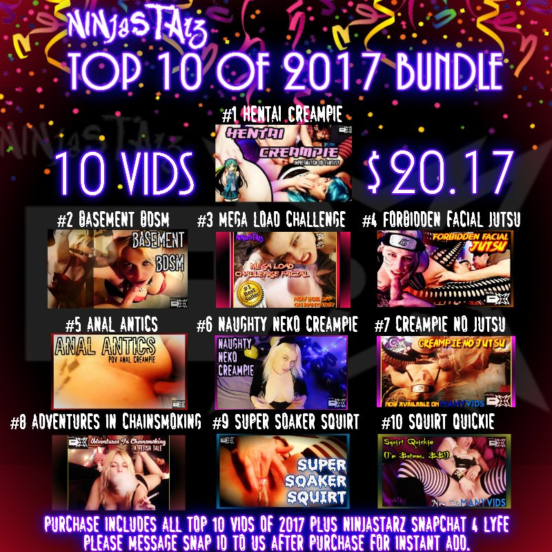 Here they are, the #NinjaStarz#Top10of2017 on #Manyvids! Grab all 10 plus our #Snap 4 Lyfe for, yep, $20.17! Message our MV inbox w/Snap ID after purchase! Here's to another year of Ninja Porns! #HappyNewYear