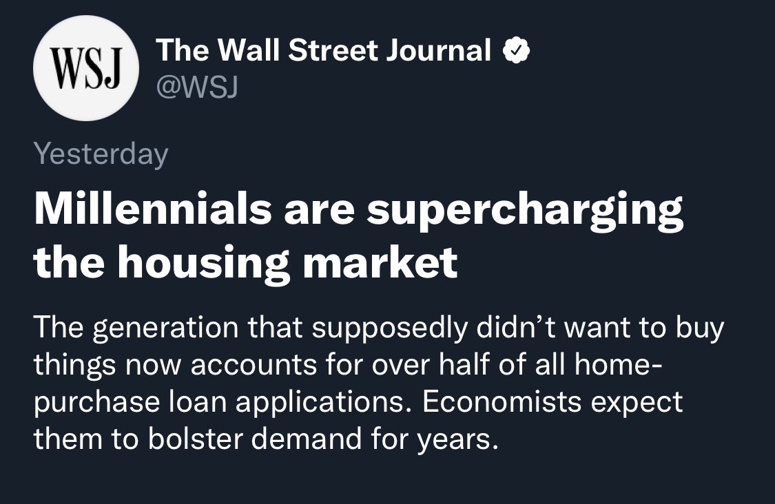 I thought it was “Millennials couldn’t buy homes because bizarre economics and restrictive housing policies made it impossible for them to buy homes until they were a decade older than previous generations.” https://t.co/7rpjV6mhsd