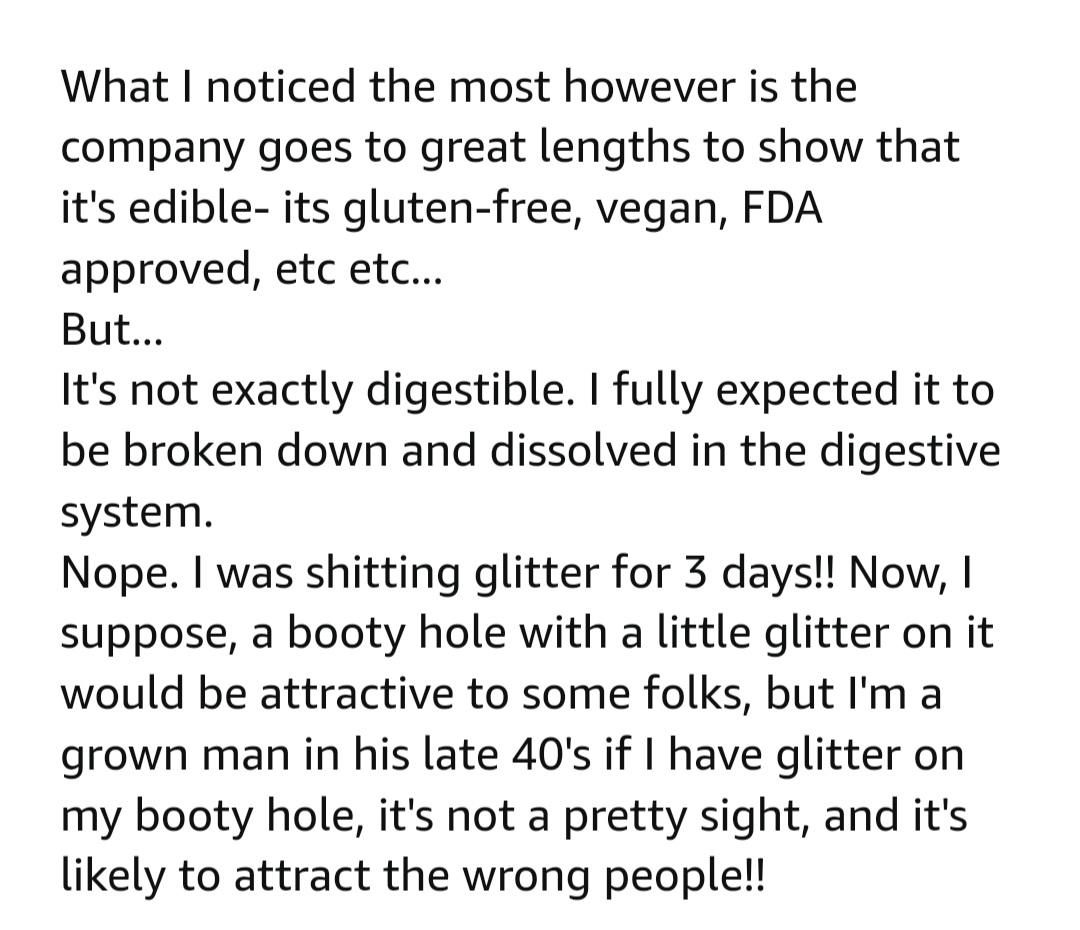 Long story but I was looking for edible glitter and found this review... https://t.co/AVjsTGEPdg