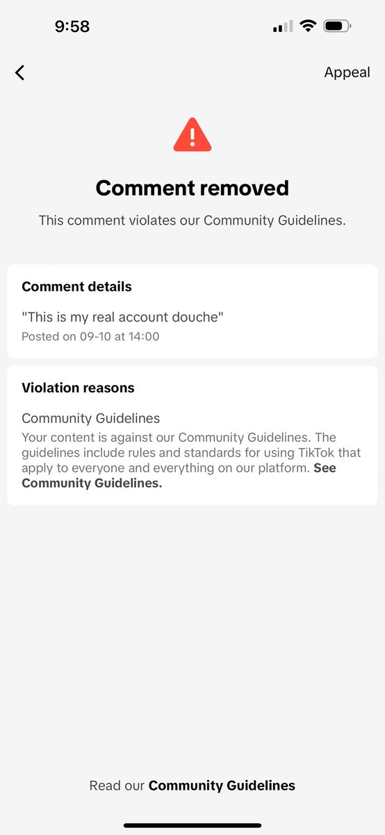 So I reported a fake TikTok account but before I did I called them a douche and I guess that person reported my comment hahah you scammers are for rea...