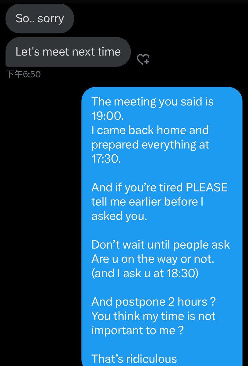 最討厭被人放鳥了!😡 如果很累我可以體諒。旦請提早跟對方說,不要等到對方傳訊息,才說要延後。 Don’t fool me like this, I think I’m a nice guy. If you’re tired PLEASE tell me earlier before I asked....