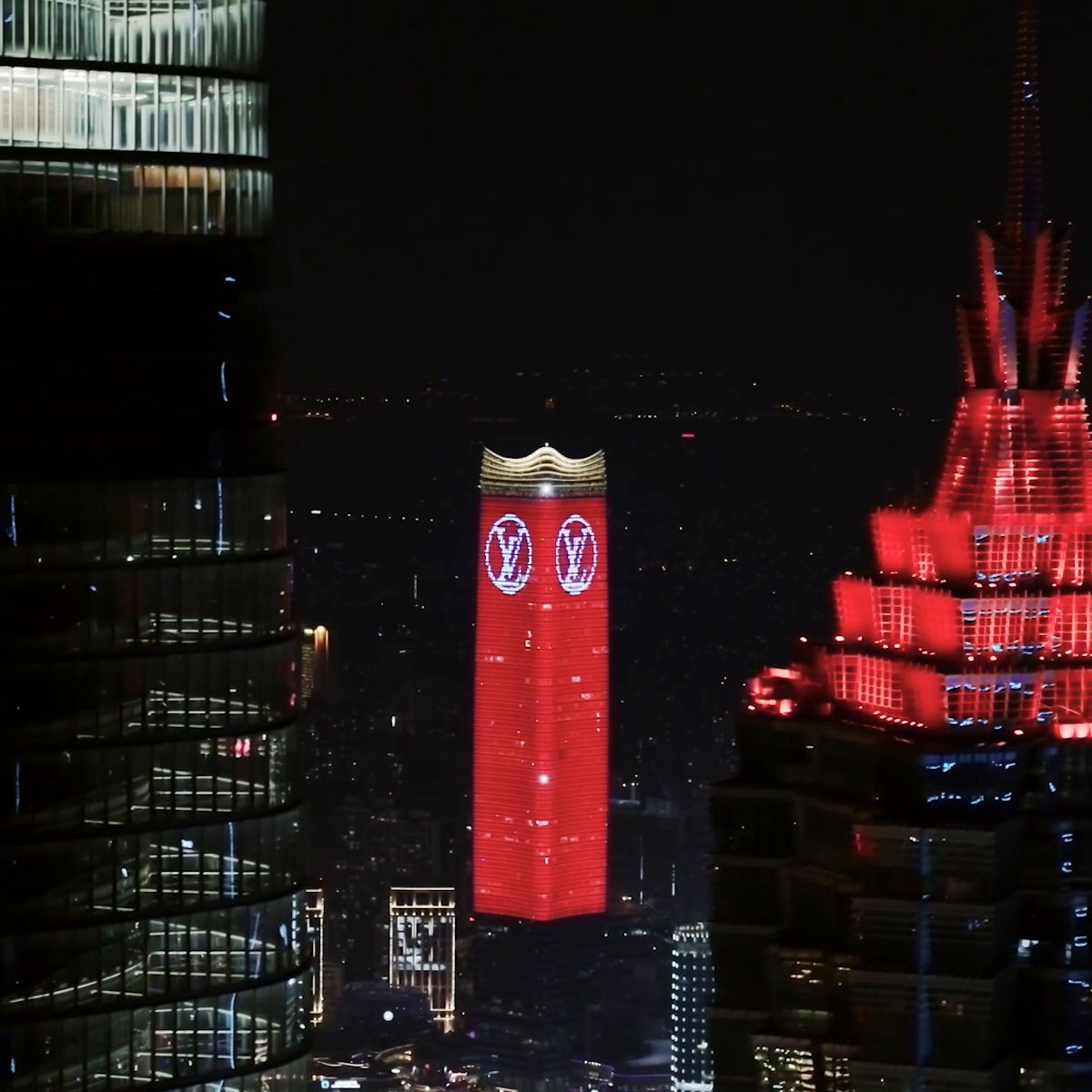 A bird’s eye view. Matching the color of ’s show at the Louvre in Paris, the Shanghai skyline illuminated in vivid red. Watch the show on Twitter or h...