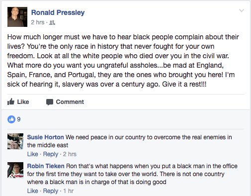 Does anybody know who these racists, Ronald Pressley and Robin Tieken are on FB? Call their jobs. https://t.co/qUuE8icwHN