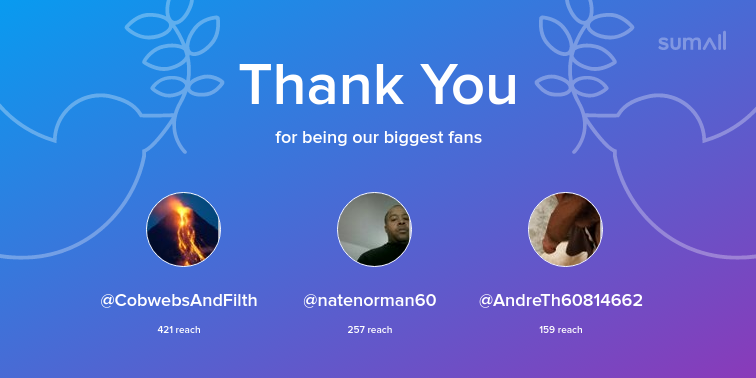 Our biggest fans this week: CobwebsAndFilth, natenorman60, AndreTh60814662. Thank you! via https://t.co/7jmtaMvHaC https://t.co/x1uYpRTElU